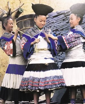 要论“叠穿”的数量之最,则当属贵州大方县显母村的苗族女性了。与苗族惯用银饰的固有印象不同,这里的苗族女性鲜以银为饰,她们用数量极为可观的服饰“叠穿”来彰显富裕。节日里,显母村的苗族女性换上盛装——数条百褶裙系在腰间,塑造出丰腴的臀部造型,内层裙子素净无花,外层裙子则布满条带状蜡染装饰。在这个难得的大型社交场合,未婚女孩通过“叠穿”后的独特造型来展示自己的魅力,衣物的数量和精致程度成为了吸引异性、获得肯定的重要标准和获得美好婚姻的重要条件。到了婚礼时,女性所着裙子的数量更是可达35条。婚后,她们要在裙边加上一圈深色边饰以作标识。