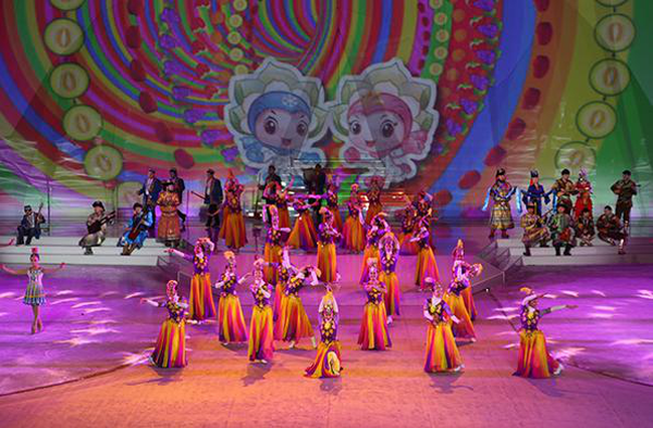 2016年1月20日,为期11天的第十三届全国冬季运动会在乌鲁木齐冰上运动中心速滑馆拉开大幕。开幕式由体育仪式、文体表演和点燃主火炬塔三个部分组成。在文体表演章节,承担本次开幕式文体表演与伴舞任务的新疆艺术学院200名学生与来自新疆各民族的文艺工作者一起,为观众献上了一台精心策划和编排、以“冰雪天山阳光丝路”为主题的精彩表演。参加开幕式文体表演的舞蹈系2014级、2015级学生,大部分是第一次参加国家级的大型活动,他们克服严寒,用自己的实际行动为精彩冬运会助力添彩