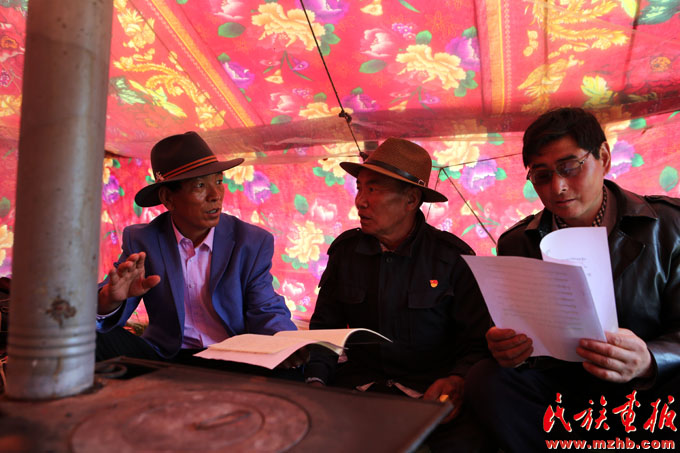 土旦(左)入户向牧民宣传草原法律法规和国家相关草原保护政策(黄若天 摄影)