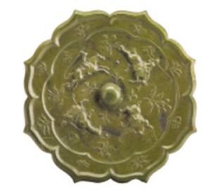 目前我国仅存三面有关打马球图案的铜镜,一件为故宫博物院的传世品,另一件收藏于安徽怀宁县博物馆,而以扬州出土的这一面铜镜保存最好,是唐镜中的珍品。这枚打马球纹铜镜收藏于江苏省扬州博物馆,直径18.5厘米、厚1厘米,1965年出土于扬州邗江泰安金湾坝工地。镜为菱花形,圆钮。镜背主纹为4名骑士,有的高举鞠杖,作抢球状;有的俯身向前,鞠杖向下,作击球状;四马驰骋,四人抢球,气氛热烈紧张;人与球之间衬以高山、花卉纹,显现出在郊外运动场比赛的情景,更添一丝活泼的生活气息。