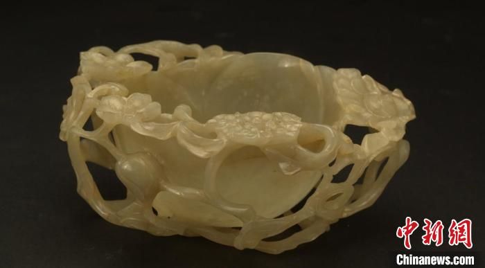 展览展出的明代白玉透雕莲花杯,以莲花作器型,粗枝大叶和莲花相衬托,造型别致,做工精美。