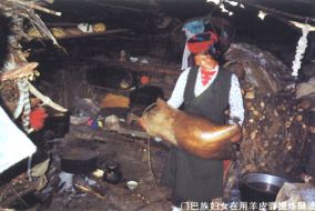 门巴族妇女在用羊皮囊提炼酥油