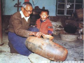 藏族老人用古老的陶器提练酥油