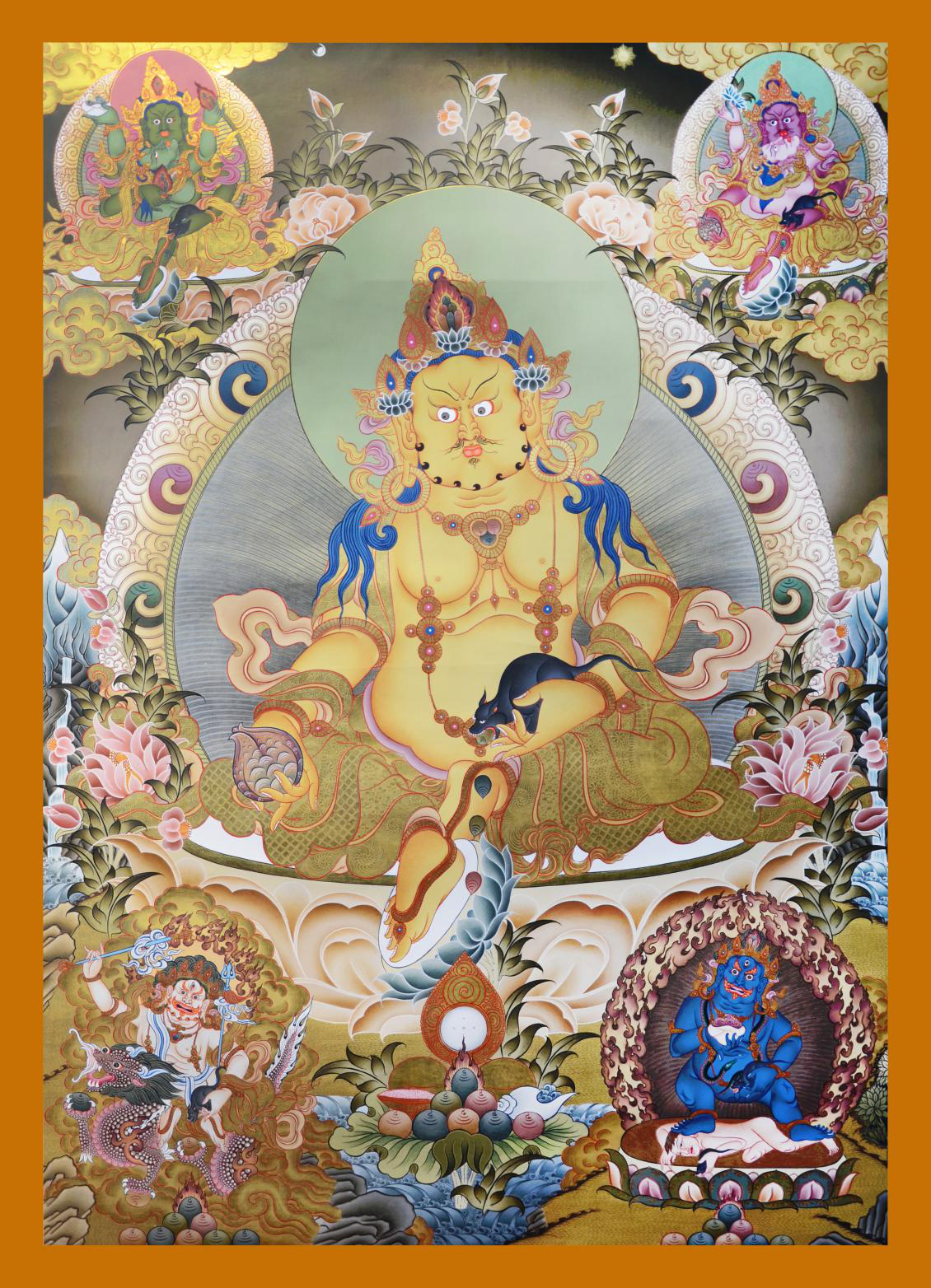 这个唐卡上面是五路財神。左上角是綠財神,右上角是紅財神。左下角是黑財神,右上角是白財神。