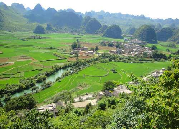 万峰林景色丰富,登高远眺,青灰色的秀峰似林,黄绿相间的田野成片,就在这万峰环抱当中,静静横卧着纳灰小村,小河从村中静静弯曲流淌而过,宛如一幅浓墨重彩的山水画卷。