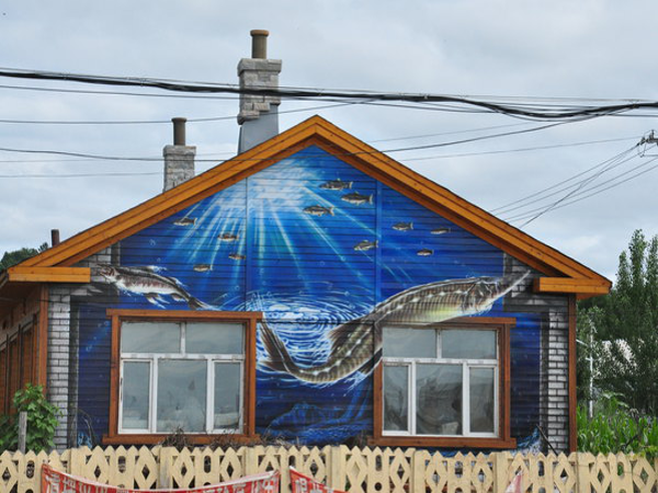 走进文化村,首先映入眼帘的是楹联:“青山环抱藏万古之瑰宝,地比江南独显渔猎风情”,门前的赫哲族青年穿着民族盛装跳起欢迎舞蹈。