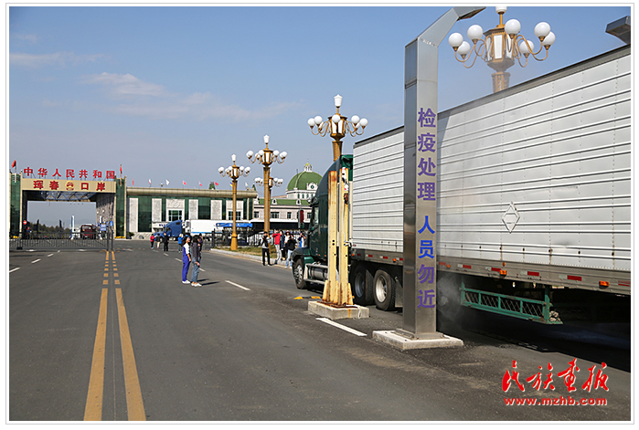 不断有旅游大巴和货车从珲春口岸驶过。图为准备入境中国的俄罗斯大货车做检疫处理
