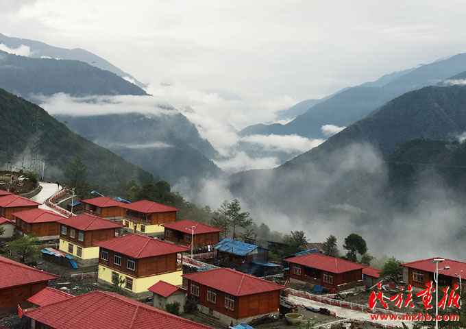 在高山之巅新建起来的达木珞巴民族乡的安居房,是茫茫云海中最鲜艳的一抹红(央金 摄影)