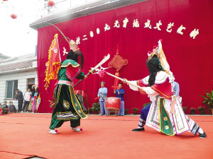 对汉民族所崇拜的英雄豪杰、尚武精神,大寨村的布依族祖先没有排斥,在保持自己民族习惯的同时大胆接受。也许,在他们心中,具有傩戏性质的地戏可以驱除不良习气。
