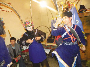 请“脸子”是地戏表演时一个非常讲究的开场仪式。“屯堡地戏”的请脸子仪式通常是整个戏班子的人都必须参加祭拜。表演时必须郑重地从箱子里请出珍藏的“脸子”,“脸子”才具有神的灵性。可是我们看到的大寨布依地戏,在保持传统的同时又不失自己的个性。通常请“脸子”是由当地长老一个人完成所有的祭拜过程,一切都是那么简单。祭拜中都是用当地的布依话娓娓道来,这样的表演给它增添了别有的韵味。