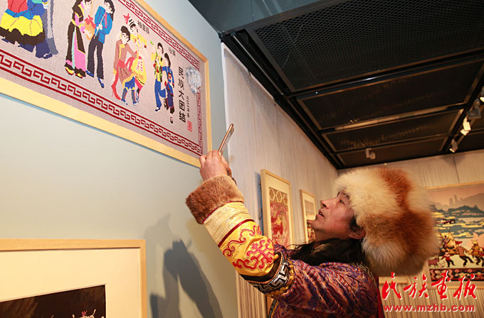 裕固族作家拿起手机拍摄《民族大团结》织锦中的裕固族图案