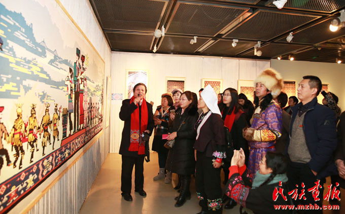 会上中国民族博物馆党委副书记、副馆长张志文向少数民族作家们介绍了展览,他说:“土家族是一个历史悠久的民族,现在有835万人口。土家织锦也有两千多年的发展历史,有250多种传统图案,是中国民间五大织锦之一,堪称中国服饰文化中的奇葩。中国民族博物馆从历年征集收藏的300多幅清代以来的土家织锦中,选取了156幅精品土家织锦、21分钟传承人视频和120余幅土家民族风情照片。我们和中国妇女儿童博物馆合作举办了这个高品质的专题展,旨在传承和弘扬土家族国家级非物质文化遗产。”