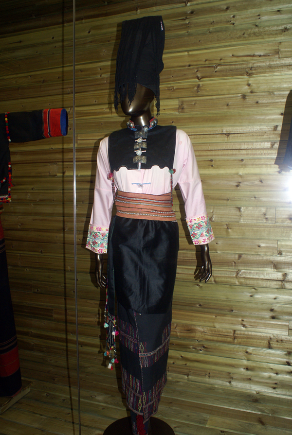 高包头是梁河地区已婚妇女特有的头饰。阿昌语称之为“屋摆”。这种头饰用自织自染的两头坠须的黑棉布长帕缠绕在梳好发髻的头上,造型高昂雄伟,足有半米多高,将其展开,长达5至6米。据调查,在我国具有包(戴)头饰习俗的众多民族中,阿昌族已婚妇女头饰的高度名列首位。关于高包头的禁忌甚多,包戴仪式神圣庄重,第一次包戴必须在婚礼后,由儿女双全的中年妇女在新房内帮包。平时包取,长辈晚辈互相回避,外人不可随意触及。关于这种头饰的来历,民间有两种传说:一说远古时候,没有天地,世界一片混沌,始祖遮帕麻和遮咪麻造天织地,共同创造了人类,然而恶魔腊訇造了太阳乱世,遮帕麻几经“斗法、斗梦”,终于用神弓射落了假太阳,世界又重获新生。据说,阿昌族妇女的高包头就是遮帕麻射落假太阳的神箭箭头的标志。另—种传说:在遥远的古代,阿昌族家园备受外敌侵扰。在一次血战中,男子弹尽粮绝,女人送箭受阻。一位妇女想出了一个绝妙的主意,让前方男子都用布带包成高包头,后方妇女便向“高包头”射箭支援。这样,男人既从包头上获得了支援,又迷惑了敌方,敌方也将箭误射向高包头。高包头挽救了阿昌人的性命,保卫了阿昌族家园。为了纪念这次战斗和那位妇人的机智勇敢,阿昌族妇女从此就包起了高包头。