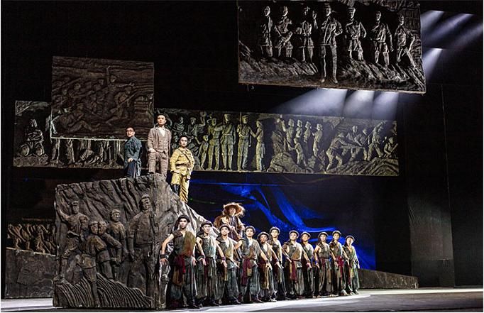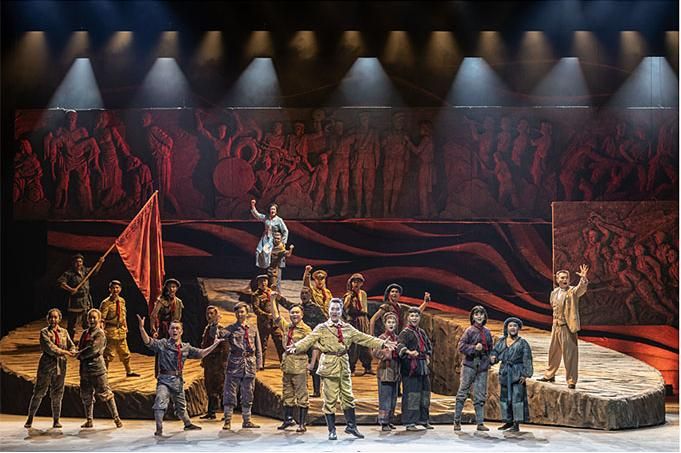 在舞蹈语言的设计上,编导融入当代元素,使观众不但感受到审美的亲切与现代感,而且还自然地进入回望历史的情境,对其思想内涵的理解更为准确。该剧的道具使用和调度也颇为大气,令人印象深刻。一组斜坡状的大型舞台道具不但由群众演员直接移动而实现即时的场景调度,还可使演员上下和左右而行,最终组合成巨大的中国共产党党徽,辅助完成了人民英灵和英雄的形象塑造。