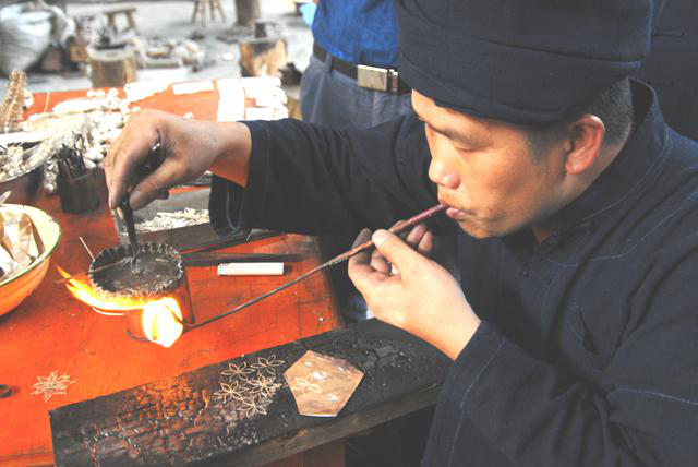 铸炼:将银料放在“银窝”(坩埚)内,置于炉上加热。银料全部熔化成液体后,把它倒在卡条状的糠槽内,待其凝固。