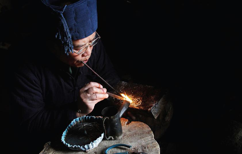 银饰锻制是苗族民间独有的技艺,所有饰件都通过手工制作而成。银饰的式样和构造经过了匠师的精心设计,由绘图到雕刻、制作有30道工序,包含铸炼、捶打、编结、焊接、洗涤等环节,工艺水平极高。