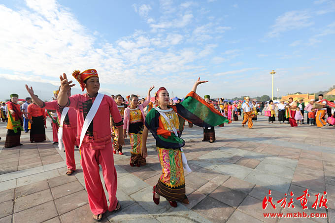 广场上,来自瑞丽市、陇川县的傣族演员跳起了噶秧舞。来自瑞丽市民间傣协会的岩保告诉记者,每年的新年庆典活动德宏州各个县市的民间傣协会都会互相往来。在傣历新年,傣族群众要用“赶摆”的方式庆祝新年的到来,并相互致以对新一年美好生活的祝愿。