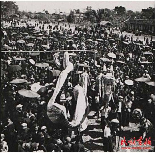 “歌圩”是桂西壮族古老的风俗。每年农历正月、二月、四月都有歌圩日。图为1957年广西壮族自治区凭祥市郊区的歌圩日,这里不但处处欢歌笑语,还有抢花炮、演壮戏、舞彩龙、舞彩凤、唱桂剧等很丰富的文娱活动