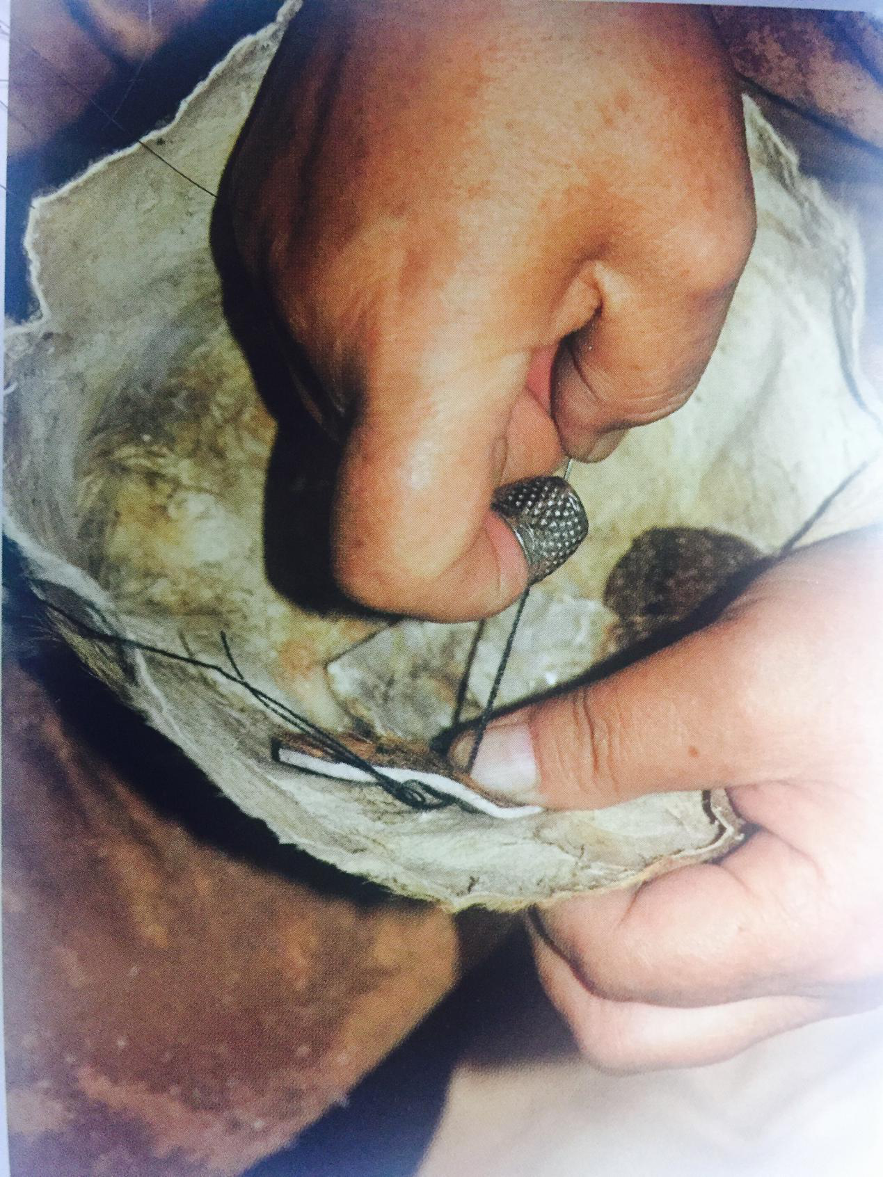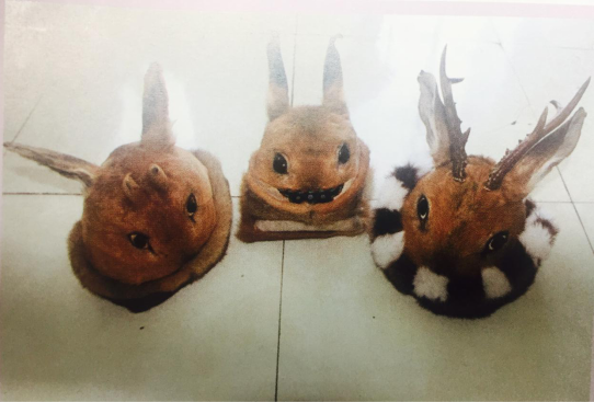 狍角帽是用整狍子的头颅,去掉骨肉后,保留狍头上的毛、角、耳朵、鼻子和口,精心鞣制而成。主要制作流程是:剥皮,清洗、熟皮,定型,补眼睛、刺绣、制作绣片,缝合护耳与头皮,制作里衬。制作时,如何剥得完整的头皮,是整个制作环节的关键。
