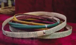 直到今天,腰箍仍在德昂族服饰中占有重要位置。按德昂人的习惯,姑娘成年后,就要在腰部佩上若干腰箍。这些腰箍大多用藤篾编成,藤圈宽窄粗细不一,有的漆成红、黑、绿等色;有的刻上花纹,包上银皮、铝皮;还有的一半是藤篾,一半是银丝。姑娘们以腰箍多、腰箍美为荣。因此,在恋爱期间,小伙子为了讨姑娘欢心,往往费尽心机地制作精巧的腰箍相赠。腰箍从传说的用来“拴住人”,演变成为用来“拴住心”。