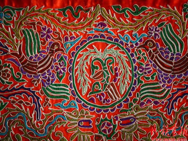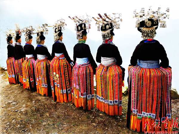 黎锦、壮锦、艾德莱斯绸、氆氇、苗绣、羌绣、马尾绣、蜡染、扎染……当我们面对这些精美的作品时,我们很难想象到这些东西是由少数民族妇女的双手,使用最简单的纺车、织机等工具创造出来的,她们靠口传心授把技法熟记于心,大自然是她们模仿的对象,她们制作出的服饰不仅色彩丰富,而且还将民族发展的历程纪录在了服饰上。很多少数民族没有自己的文字,对自己民族历史的记载除了口口相传以外,他们把一些提炼升华后的符号或织或绣或染到服饰之中。苗族的服饰文化在这一点上极其突出。苗族没有文字,苗族的历史文化是靠口头文学和服饰图画艺术来表达的。苗族老人对苗族少年讲述民族历史时,常指着服饰上的各色图案一一道来。苗族服饰再现历史的功能,成为苗族传世的“无字史书”。
