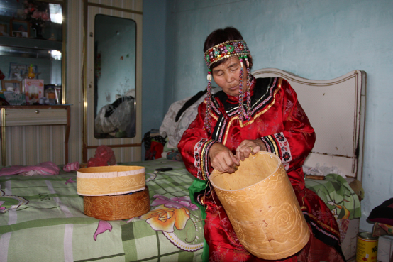 鄂伦春族素有“白桦民族”之称,白桦树皮制品种类非常多,大到可以乘人载物的桦皮船、围盖“仙人柱”的“铁克沙”,小到可以装在衣兜里的烟盒和含在口中的狍哨,提水用的桶、采集用的篓、装物用的箱、盛饭用的盆、吃饭用的碗、喝酒用的蛊等等。桦树皮制品的装饰图案可以通过压划、压印(点刺)、剔刻、烙烫、补花、绘画等多种方法形成。压印点刺是最常用的装饰手段,工具是用兽骨制成的,分单齿、双齿、多齿和简单几何形几种。先在剪裁好的器物材料上,用压、打等方法点刺出装饰纹样,再缝合成器物成品。这种装饰多为素面凹形花纹,显得朴实单纯,而且器物越陈旧桦皮颜色越深,越有光泽,图纹越清晰。也有人在压打线上着色,这便形成了另一种风格,美观艳丽而且突出了物象特征。