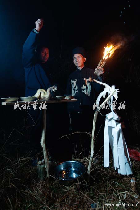 到招龙仪式活动点时,已是凌晨五点半,我们所在的位置是一个山腰,有一个小坝子。我发现参加仪式的只有十二三个人,就好奇地问:“为什么只来十多个人?”原来这些人是选出来的代表,该村有7个村民小组,共203户,有980多人口,每次招龙大喜时,要从村民中推选出12位作为招龙代表,从头到尾主持一切事务。说话间,村里人就开始忙着生火,或准备各项招龙工作。他们用木板支起一个摆放祭品的台板,摆上祭品。接着,在招龙师傅的主持下,仪式正式开始。第一个程序是“喊白虎龙”,苗家称为“共阶夸羊捌”,师傅拿着一个白公鸡,进行一番念诵后宰杀掉,等鸡煮熟后再摆上祭台。