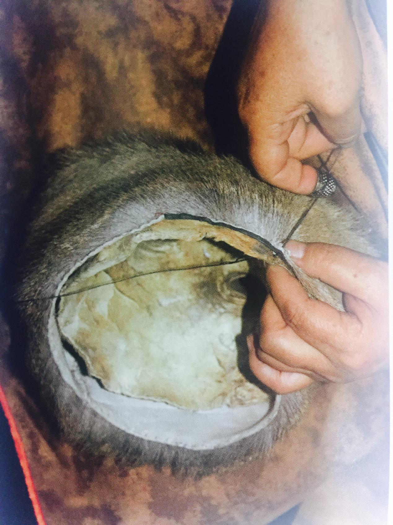 狍角帽是用整狍子的头颅,去掉骨肉后,保留狍头上的毛、角、耳朵、鼻子和口,精心鞣制而成。主要制作流程是:剥皮,清洗、熟皮,定型,补眼睛、刺绣、制作绣片,缝合护耳与头皮,制作里衬。制作时,如何剥得完整的头皮,是整个制作环节的关键。