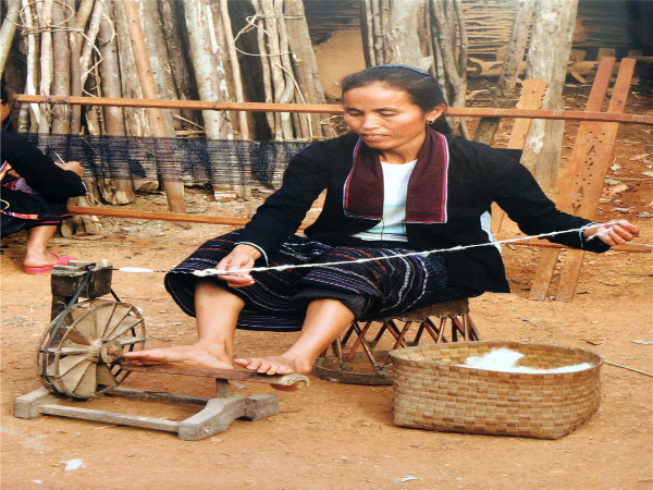 “纺”是把野生棉花或木棉花用绞棉机去除棉籽后捻成线,缠绕到手捻纺轮车上,包括错纱、配色、综线、攀花等。