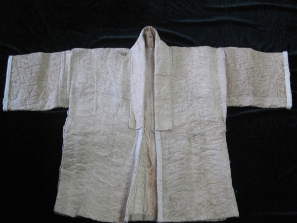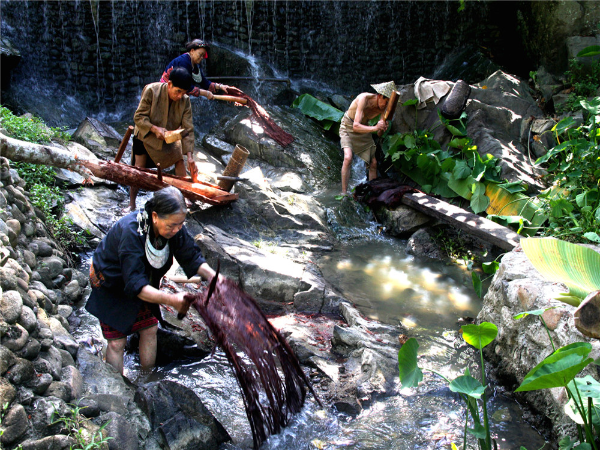 树皮布是以植物树皮为原料,经过选树木、扒树皮、修整、浸泡脱胶、漂洗、晒干、拍打等步骤制成的一种无纺布料。加工好的树皮布经裁剪、缝制可以做成被子、帽子上衣、帽子等。