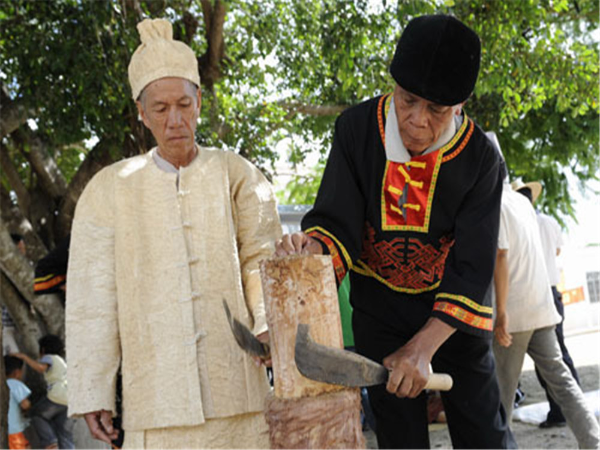 黎族树皮布制作技艺:黎族制作树皮布的历史悠久,树皮布是人类衣物从无纺布向有纺布发展的历史见证。据考古学家研究,海南岛树皮布的历史约有4000年。延续了数千年的树皮布,记载了人类发展的历程。尽管树皮布已失去了它往日的作用,可是黎族人民却不能忘记祖辈传承下来的技艺。如今在哈方言、润方言黎族中,有些家庭将制作树皮布的技艺代代相传,他们的子孙仍能识别制作树皮布的树种,并能掌握制作树皮布的技术,这对研究黎族早期无纺布有着重要的意义。然而,目前整个海南省掌握树皮布制作技艺的民间艺人不足5人。