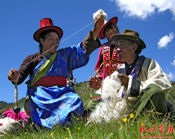 在放牧时裕固人常常捻羊毛。 央金 摄影 引自民族画报