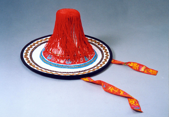 裕固族东西部地区服饰上的不同之处主要表现在女子服饰上。西部的女帽是尖顶,帽檐后部卷起,用绵羊羔白色毛擀制而成,帽檐镶有一道黑边,内镶黑色锯齿花边和各色丝线滚边,帽顶腰部的前面,有一块刺绣精致的图案缝在上边。东部的女帽是大圆顶帽,形似礼帽,帽顶比礼帽细而高,红布缝制帽里,白布缝制帽面,帽檐也缝有黑边或镶有各色花边。