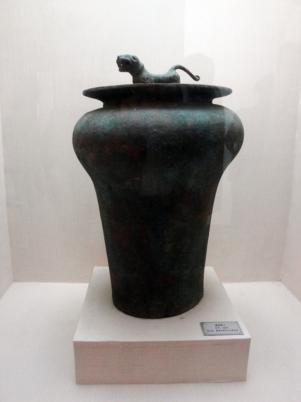 为巴文化最具代表性的青铜乐器,高68cm,上径36cm,底径28cm,重30公斤。1989年夏,万州甘宁乡发大水,錞于从红旗水库泄洪道巨石缝中被发现,由万州博物馆收藏。2005年6月,调集到重庆中国三峡博物馆。这件錞于属战国晚期的巴人作品,其通体完整,音质优良,造型厚重,形体特大,有“錞于王”之誉。其上部的钮作虎形,栩栩如生,不怒而威,虎腿以漩纹勾画出神物特征,是巴人虎崇拜的又一重要例证。虎钮的周围,分布着五组“图语”:椎髻人面、羽人击鼓与独木舟、鱼与勾连云纹、手心纹、神鸟与四蒂纹。这些图语对研究巴文化是极为重要的资料,其中羽人击鼓与独木舟已经被选取为重庆中国三峡博物馆外墙浮雕的中心图案(战国青铜虎钮錞于图片由老铁提供)。
