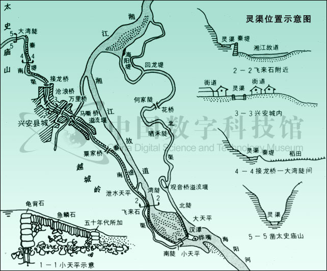 灵渠,又名零渠。以其曾部分利用灵(零)河水系的原有河道,故名。因开凿于秦,一名秦凿渠。又因位于今广西兴安县城附近,故近代或称之为兴安运河。灵渠是一条连接湘江与漓江的人工渠道,主要由铧嘴、大小天平石堤、南渠和北渠等工程构成。铧嘴是修建在湘江中的分水坝,用巨石叠砌而成,前锐后钝,形似犁铧,这是引湘入漓的关键工程,它有效地使湘江一分为二,一支顺南渠入漓江,一支沿北渠回流入湘江。南、北渠总长三十四公里,是灵渠的主体结构,是贯穿湘、漓二水的通道。在铧嘴尾端还筑有“∧”字的大小天平石堤,起着蓄水、溢洪,调剂水量的作用,能保证整个工程发挥正常的效益。