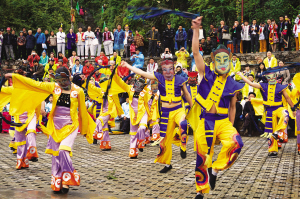 图①为祭师们手捧献给祖先的瓜果、茶、酒,等待仪式开始。图②为在乐祭中,祭师们跳起欢快的娱神舞。