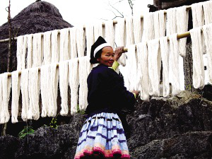 白裤瑶服饰的面料都是老阿婆手摇纺车,把一捆捆棉麻用勤劳智慧的巧手纺织成细纱,合着穗捻成匀称的线。阿妹们再将线绕到线筒上,然后轻涮漂洗,绕到高脚粮仓下。线晾干后进行纺织,一块块自纺的棉纱土布就形成了,之后就可以在这块布上尽情“作画”了。
