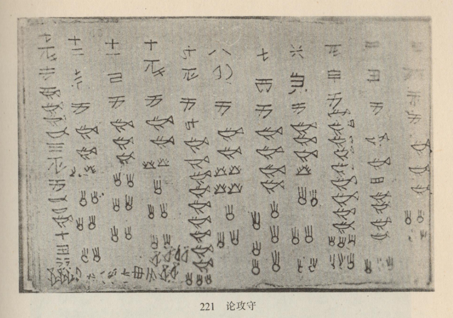 水书抄本。写于清嘉庆年间,共20页,长18厘米,宽27厘米。以竹签作笔蘸墨书写。内容述战争阵法。中图鱼形表示守方,方框为指挥位置,三角形表示山头阵地,圆圈加三画表示进攻之敌败退形象。原件存北京图书馆。