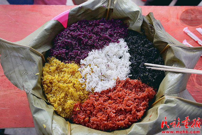 南方稻作民族将糯米用紫蕃藤、黄花、枫叶、红蓝草等泡染后再蒸煮出红、黄、黑、白、紫的五色糯米饭,五色糯米饭一般在重要的节日中食用,以求吉祥。李琳摄影 引自民族画报