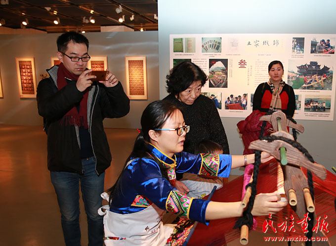 座谈会上,中国民族博物馆副馆长张志文介绍说:土家族是一个古老的民族,有着4000多年的文明发展史。土家族在全国有2个自治州、8个自治县,人口达835万。土家织锦从秦汉时期萌芽,历经賨布、溪布、斑布、土锦等几个发展阶段,在明、清时期开始定型,至今已有2000余年的灿烂历史。中纪委驻财政部纪检组原组长、全国妇女手工编织协会副会长贺邦靖说:土家织锦是土家妇女智慧的结晶,是武陵山区文化精准扶贫的重点项目之一。从这个展览上我们不仅可以看到土家织锦的灿烂与美丽,还可以看到国家实施文化精准扶贫的实效。