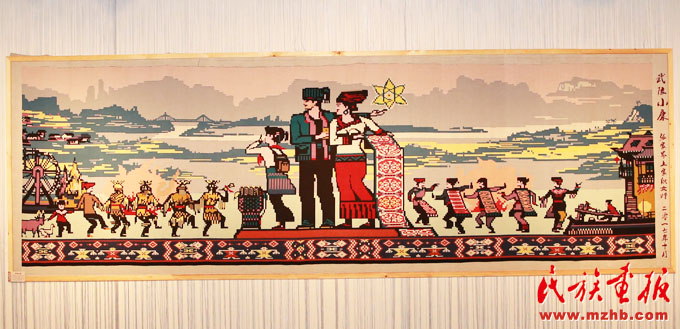 中国民族博物馆从全国土家族聚居区征集的300多幅藏品中精心挑选出156幅土家织锦精品,120余张土家风情照片和21分钟土家织锦传承人视频,展览分为“五彩斑衣——土家织锦历史回眸”“天工巧织——土家织锦工艺流程”“薪火相传——土家织锦传承人录”和“锦绣武陵-——土家织锦品类纵览”四大部分,生动全面地展示了国家级非物质文化遗产项目——土家织锦的艺术特色与文化价值。本次展览的代表性文物有1950年中南军政委员会田心桃代表赠送给毛主席的礼物土家织锦《满天星》,湖南省级传承人叶菊秀主持创作的巨幅长卷《民族大团结》(宽60厘米、长1210厘米)。特别值得一提的展品是长450厘米、宽150厘米的土家织锦《武陵小康》,织锦配色达30余种,调制有132712个色块。这是张家界市170万各族儿女为迎接党的十九大胜利召开,表现土家织女们对精准扶贫成果的欣喜,而由近百位土家织女历时五个多月制作而成的巨幅织锦,也是第一次在国家级专题博物馆公开展出。