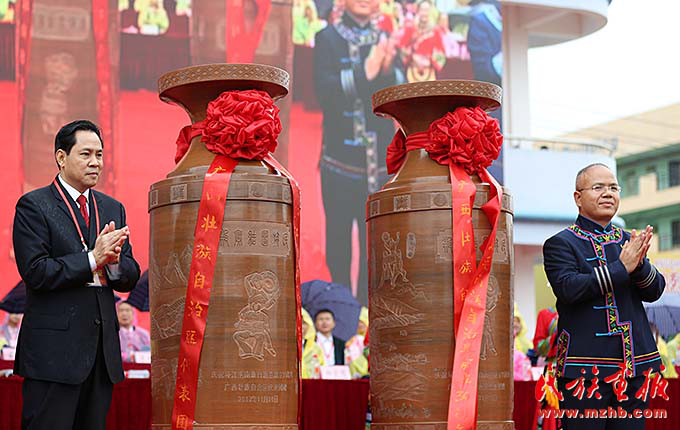 广西壮族自治区代表团向环江县赠送民族团结宝瓶(左为广西壮族自治区代表团团长,中共广西壮族自治区党委常委、政法委书记黄世勇,右为中共环江毛南族自治县委书记黄荣彪)