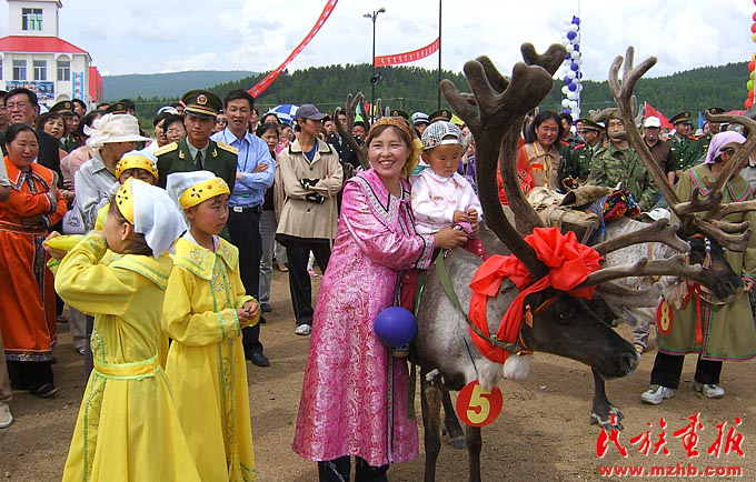 鄂温克族人饲养驯鹿历史悠久,无论男女老少都喜爱和保护驯鹿,将它们视为吉祥、幸福的象征。图为敖鲁古雅鄂温克族乡的驯鹿王比赛上的参赛驯鹿