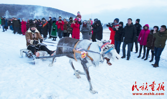 在呼伦贝尔冬季的冰雪风情节上,鄂温克族的驯鹿拉着雪橇,吸引了许多游客的目光(武倩 摄影)
