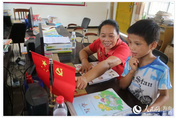 王金花教孩子认识国旗和党旗