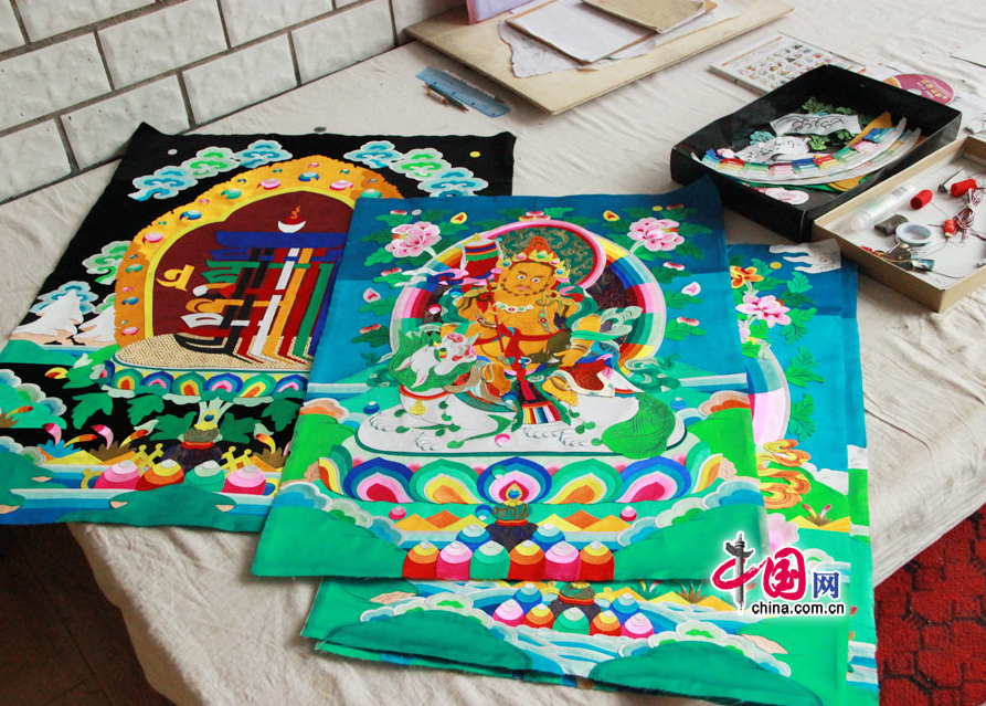 堆绣的工序一般有图案设计、剪裁、堆贴、绣制,个别图案部分上色等。堆绣先按规范的佛画绘成画稿,再按佛像不同部位的要求选用各色面料,剪贴缝制而成。小幅画面为一尊主佛像与下方两尊小佛像组成,周围配以花卉、云纹、日月、供品等图案。与传统的唐卡不同,堆绣工艺品是用各色棉布、绸、缎剪成所设计的各种图案形状,精心堆贴成一个完整的画面。其工序有图案设计、剪裁、堆贴及个别图案部分上色等。一般来讲,图案设计环节主要以客人需求为主。勾草图最能考量艺人绘画技能,也是至关重要的步骤。图案设计完成后,将各色布料比照图案剪裁、粘好,之后再填充以羊毛或棉花等,以使图案凸起,最后将各色布料图案堆贴在设计好的大幅布幔上,构成一组完整的画面,达到静中有动、生动传神、惟妙惟肖的境地。使画面产生丰富生动的立体感和织物特有的肌理感,达到浅浮雕式的艺术效果,表现力丰富。作品粗犷中显细腻,点滴中见绝妙,技艺精湛,巧夺天工。一幅堆绣可以说是一幅丝质的彩色浮雕作品,极具艺术观赏价值。