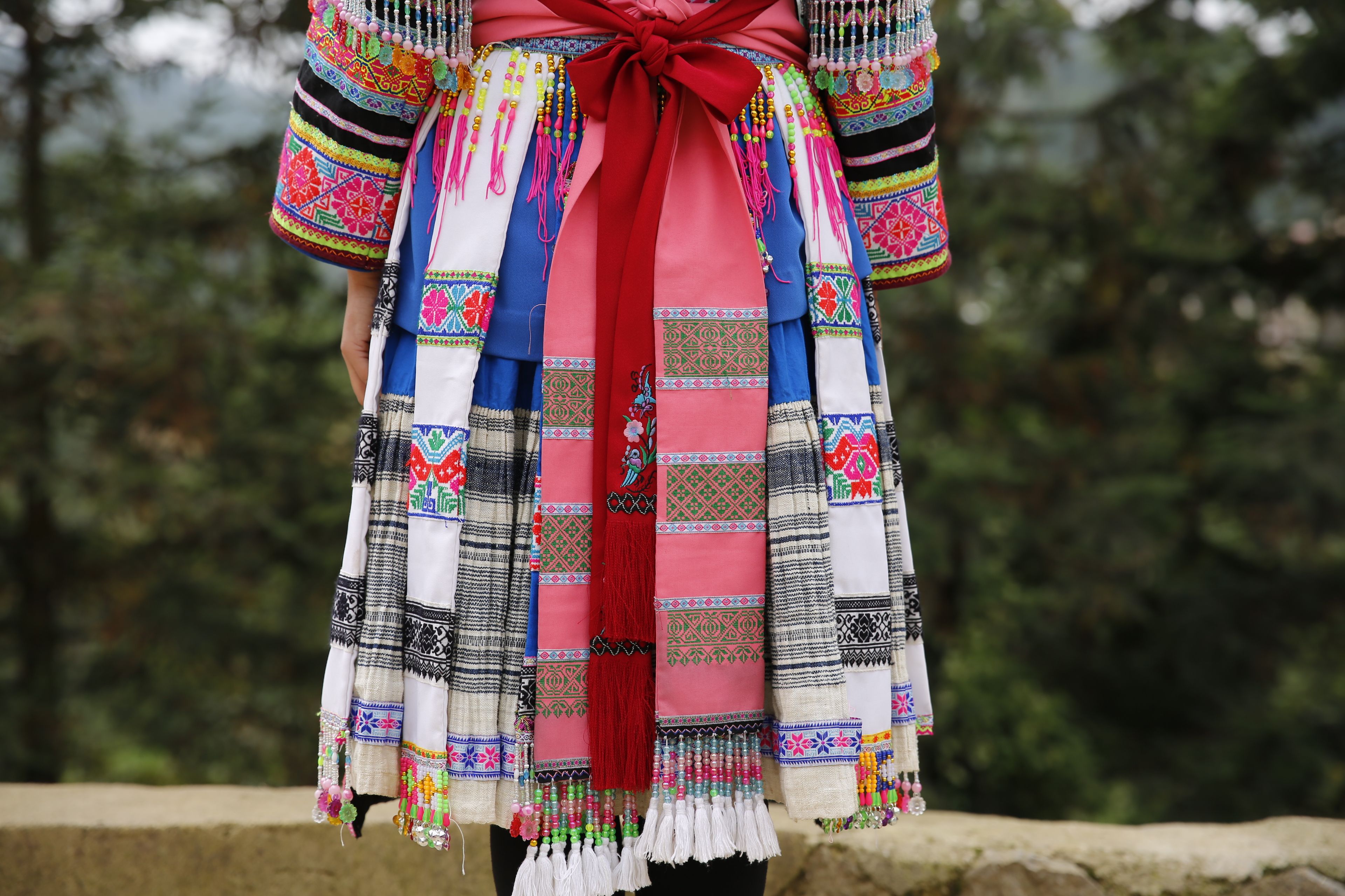 图片说明:贵州贵阳苗族女子服饰花带百褶裙