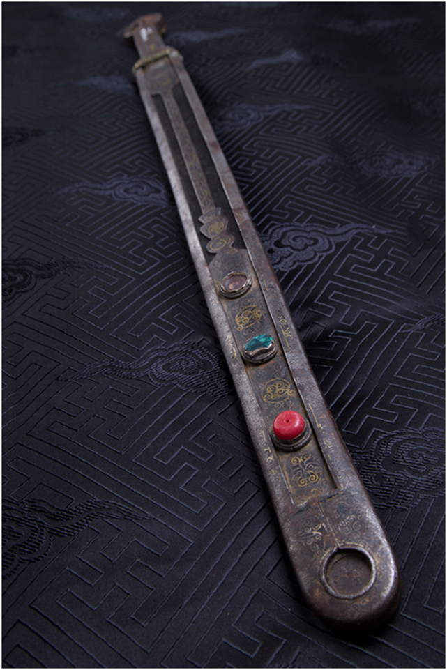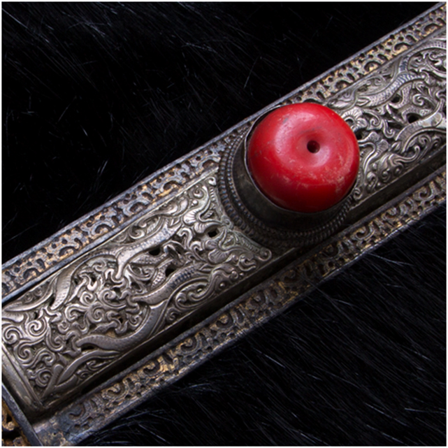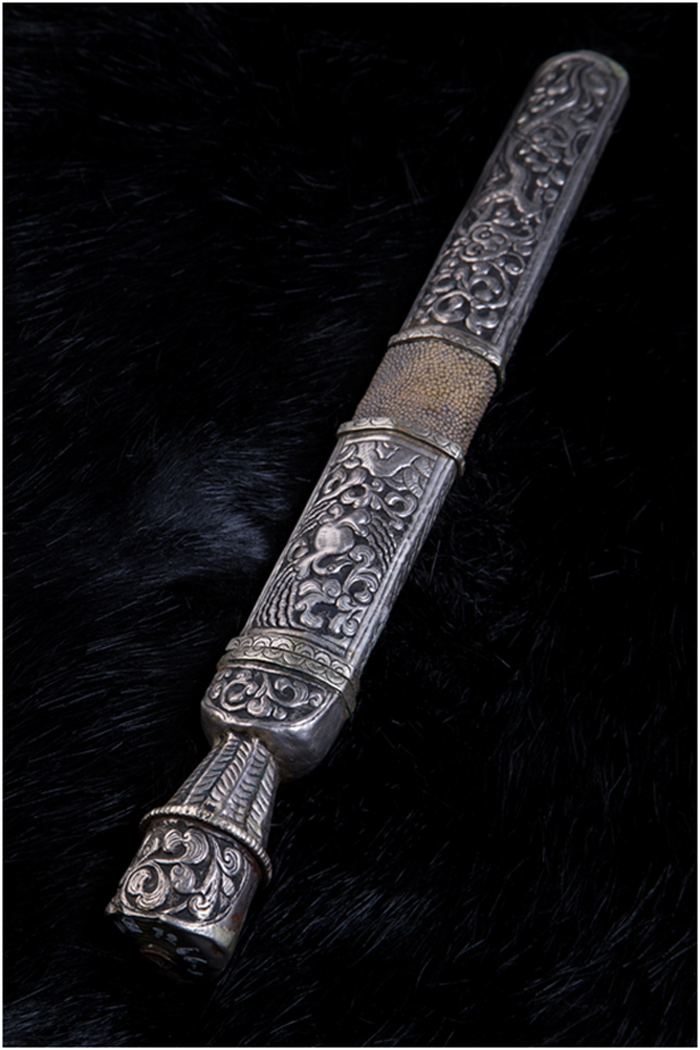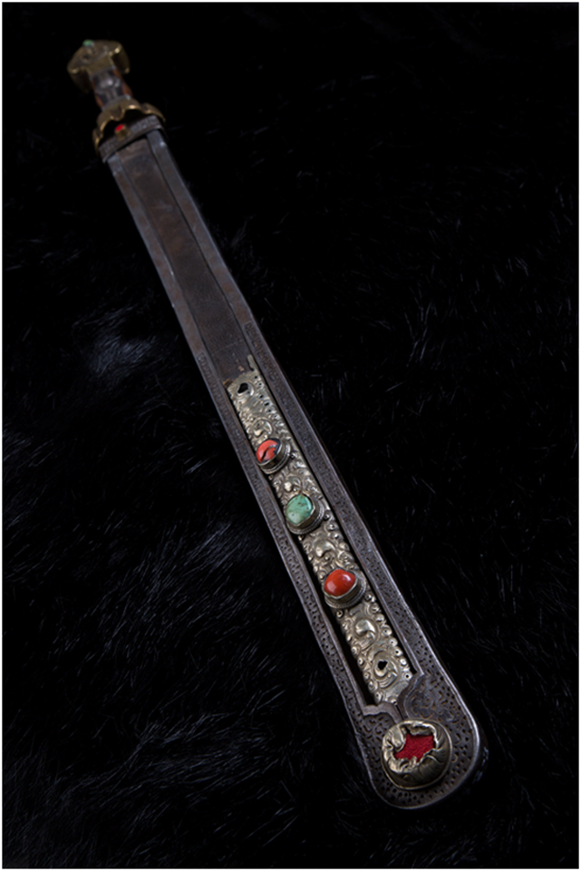 康区人性格粗犷豪放,刀对于他们来说,主要是战斗的武器,他们爱刀胜过爱牛羊,一把好刀就是一笔财富,其形象也会因之而无形中高大起来。正因为如此,他们不仅对刀本身有较高的要求,对其作为衬托武士气概的刀的外在形制也有特殊的喜好。刀鞘材料一般使用黄、白铜或纯银,镶珠嵌宝,正面雕龙画凤,背面线刻卷草,佩在身上,起到了美观和威慑的双重作用。