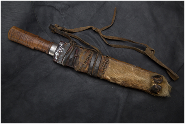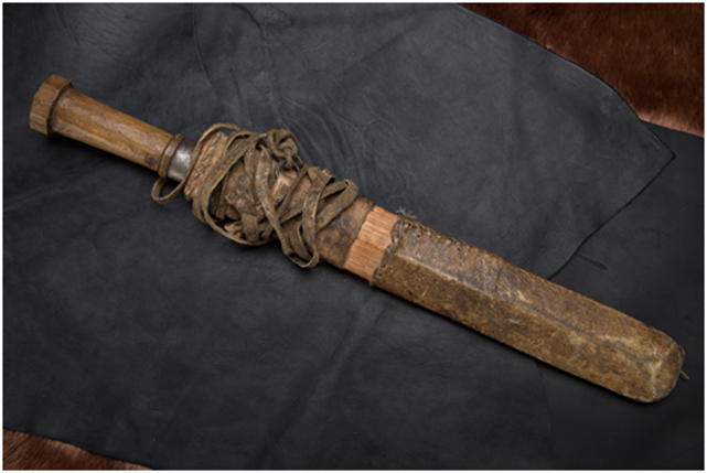 腰刀,骨柄,铁鞘缕空,兽皮勒鞘,清代