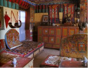 大门由于它的位置所在不应该列入室内装饰,但它与室内装饰息息相关,连成一体,故我们把它当作室内装饰在这儿加以介绍。门框装饰包含门框本身、门楣、门楣上的屋檐、门板等。藏族建筑大门装饰十分讲究,从屋檐到门坎都用雕、绘的手段充分加以装饰。屋檐用两道方本间隔排列,上盖青石片和黄土筑成底小头大的形状,它不仅有美观的装饰效果,而且起到防水作用。屋檐下是门楣,门楣上彩绘各种图案,门框的木构件上雕刻莲花花瓣和累卷叠函凹凸方格图案,这种图案处理形式大部分民居大门大同小异。门板为单开式,板门为了加固起见上、下分层钉铁条。门板一般涂单一色,不作绘画处理。除了这些装饰以外,门相上挂短绉帘,门框左右边缘墙上涂两道黑色竖条,每年过年前短绉帘要弃旧换新,黑色竖条与粉刷外墙一道重新涂漆,这是一般民居门框装饰。寺庙门框装饰较为复杂,门楣的间隔方木上加一层雕刻动物头像的木雕作品排成一行,装饰门楣这一板块,门框木构件多则六、七层,层层雕刻各种图案,可见其讲究程度。寺庙门板大多是对开式,用铁条包装门边缘,中间分层钉铁条,涂一层单一的颜色,特殊殿堂如扩法神殿大门门板上要进行绘画处理,寺庙大门讲究厚重、庄严。无论是民居大门还是寺庙大门,其装饰要求与室内梁柱装饰相协调,从颜色的运用到雕刻内容都要做到这一点,保持内外装饰效果统一。